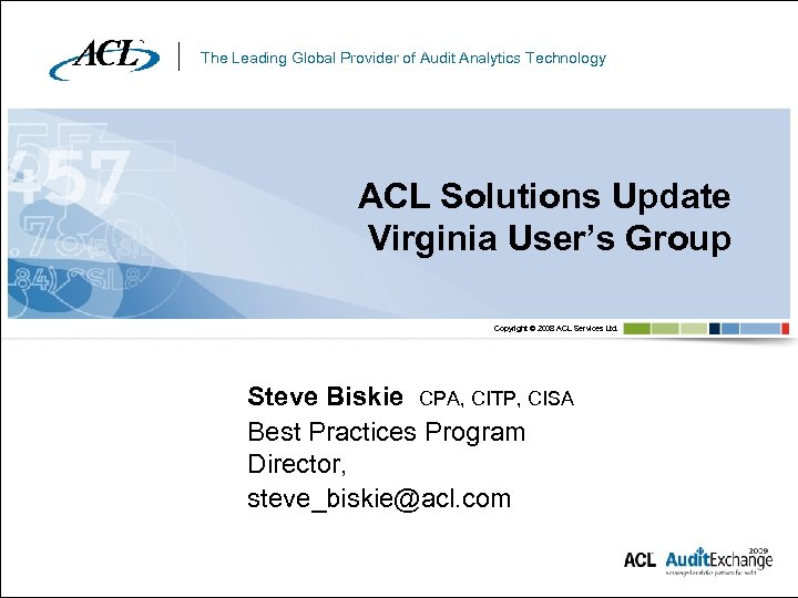 The Leading Global Provider of Audit Analytics Technology ACL Solutions Update Virginia User’s Group Copyright © 2008 ACL Services Ltd. Steve Biskie CPA, CITP, CISA Best Practices Program Director, steve_biskie@acl. com