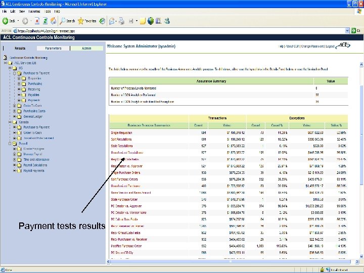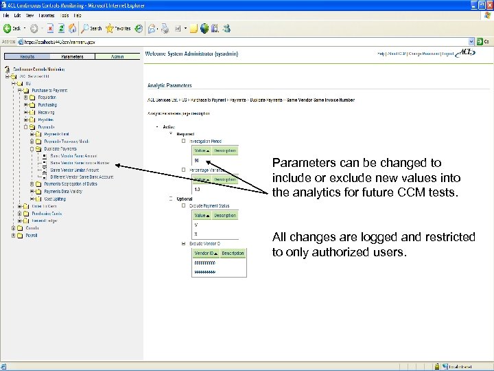ACL Services Ltd. Copyright © 2008 ACL Services Ltd. Parameters can be changed to include or exclude new values into the analytics for future CCM tests. All changes are logged and restricted to only authorized users.