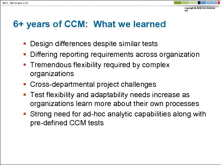 ACL Services Ltd. Copyright © 2008 ACL Services Ltd. 6+ years of CCM: What we learned § Design differences despite similar tests § Differing reporting requirements across organization § Tremendous flexibility required by complex organizations § Cross-departmental project challenges § Test flexibility and adaptability needs increase as organizations learn more about their own processes § Strong need for ad-hoc analytic capabilities along with pre-defined CCM tests