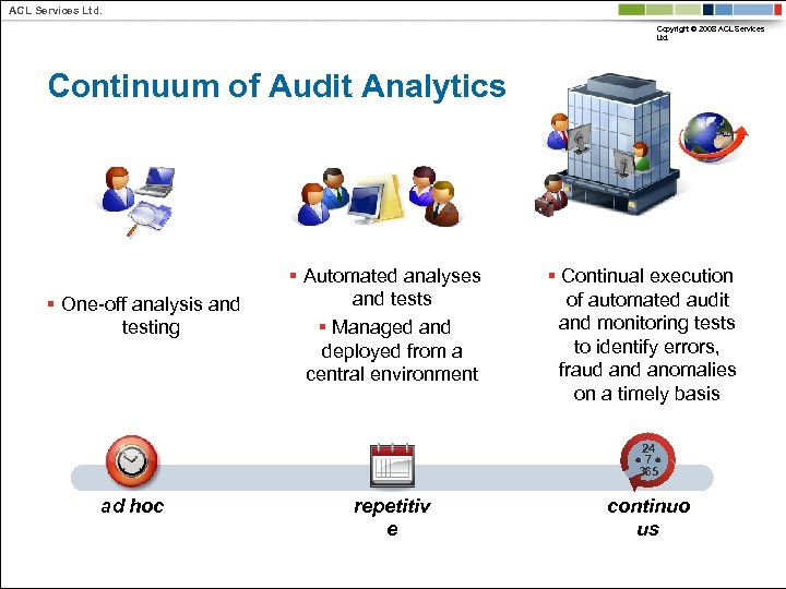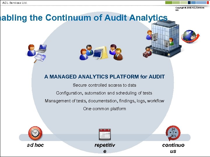 ACL Services Ltd. Copyright © 2008 ACL Services Ltd. nabling the Continuum of Audit Analytics A MANAGED ANALYTICS PLATFORM for AUDIT Secure controlled access to data Configuration, automation and scheduling of tests Management of tests, documentation, findings, logs, workflow One common platform 24 7 365 ad hoc repetitiv e continuo us
