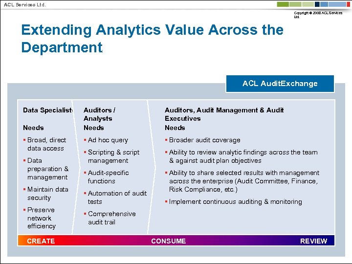 ACL Services Ltd. Copyright © 2008 ACL Services Ltd. Extending Analytics Value Across the Department ACL Audit. Exchange Data Specialists Needs § Broad, direct data access § Data preparation & management § Maintain data security § Preserve network efficiency CREATE Auditors / Analysts Needs Auditors, Audit Management & Audit Executives Needs § Ad hoc query § Broader audit coverage § Scripting & script management § Ability to review analytic findings across the team & against audit plan objectives § Audit-specific functions § Ability to share selected results with management across the enterprise (Audit Committee, Finance, Risk Compliance, etc. ) § Automation of audit tests § Implement continuous auditing & monitoring § Comprehensive audit trail CONSUME REVIEW