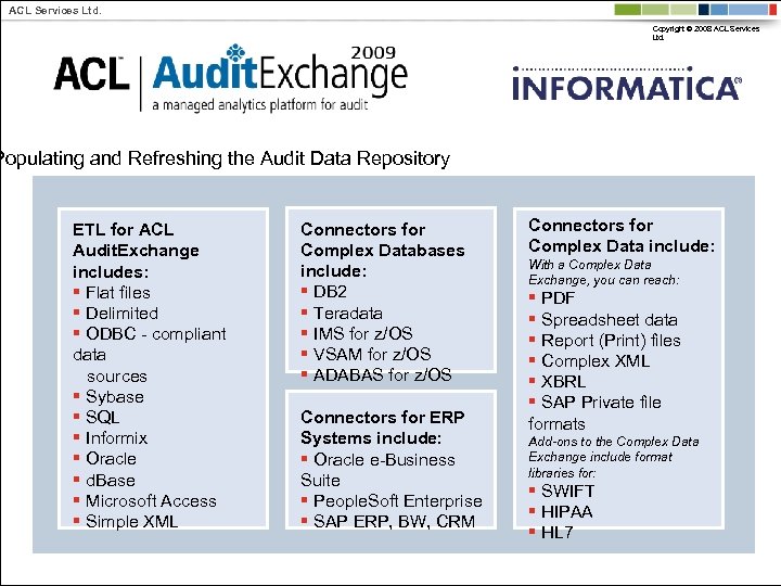 ACL Services Ltd. Copyright © 2008 ACL Services Ltd. Populating and Refreshing the Audit Data Repository ETL for ACL Audit. Exchange includes: § Flat files § Delimited § ODBC - compliant data sources § Sybase § SQL § Informix § Oracle § d. Base § Microsoft Access § Simple XML Connectors for Complex Databases include: § DB 2 § Teradata § IMS for z/OS § VSAM for z/OS § ADABAS for z/OS Connectors for ERP Systems include: § Oracle e-Business Suite § People. Soft Enterprise § SAP ERP, BW, CRM Connectors for Complex Data include: With a Complex Data Exchange, you can reach: § PDF § Spreadsheet data § Report (Print) files § Complex XML § XBRL § SAP Private file formats Add-ons to the Complex Data Exchange include format libraries for: § SWIFT § HIPAA § HL 7