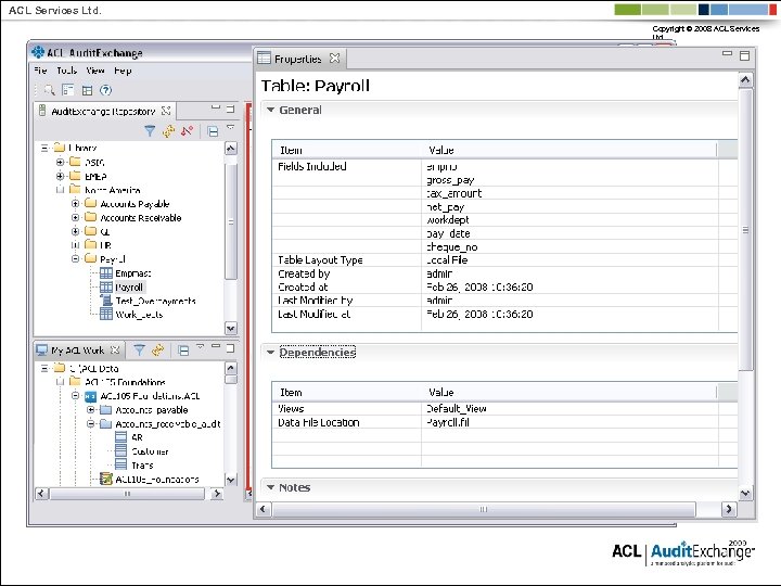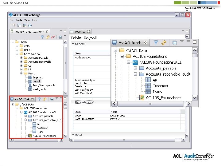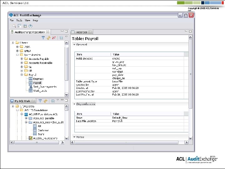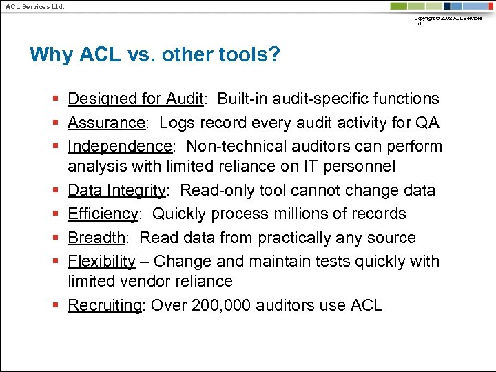 ACL Services Ltd. Copyright © 2008 ACL Services Ltd. Why ACL vs. other tools? § Designed for Audit: Built-in audit-specific functions § Assurance: Logs record every audit activity for QA § Independence: Non-technical auditors can perform analysis with limited reliance on IT personnel § Data Integrity: Read-only tool cannot change data § Efficiency: Quickly process millions of records § Breadth: Read data from practically any source § Flexibility – Change and maintain tests quickly with limited vendor reliance § Recruiting: Over 200, 000 auditors use ACL