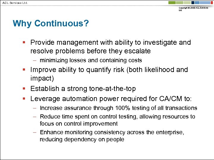 ACL Services Ltd. Copyright © 2008 ACL Services Ltd. Why Continuous? § Provide management with ability to investigate and resolve problems before they escalate – minimizing losses and containing costs § Improve ability to quantify risk (both likelihood and impact) § Establish a strong tone-at-the-top § Leverage automation power required for CA/CM to: – Increase assurance through 100% testing of all transactions – Reduce time spent on control testing, allowing resources to focus on control improvement – Enhance monitoring consistency across the enterprise, reducing dependency on people