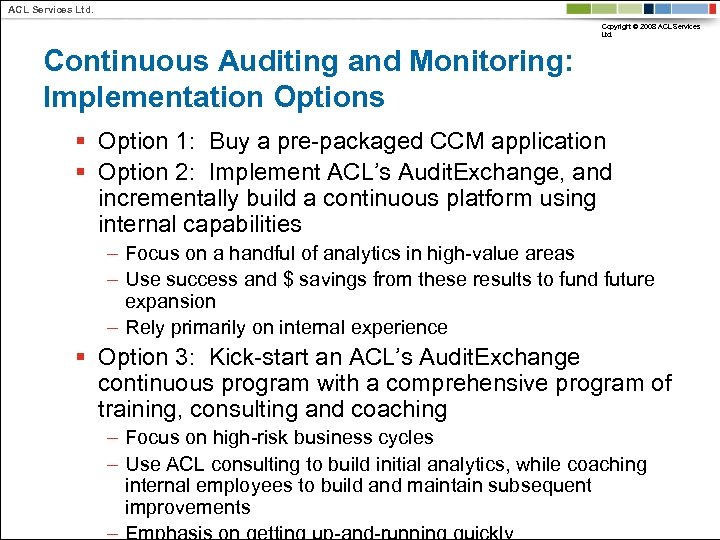 ACL Services Ltd. Copyright © 2008 ACL Services Ltd. Continuous Auditing and Monitoring: Implementation Options § Option 1: Buy a pre-packaged CCM application § Option 2: Implement ACL’s Audit. Exchange, and incrementally build a continuous platform using internal capabilities – Focus on a handful of analytics in high-value areas – Use success and $ savings from these results to fund future expansion – Rely primarily on internal experience § Option 3: Kick-start an ACL’s Audit. Exchange continuous program with a comprehensive program of training, consulting and coaching – Focus on high-risk business cycles – Use ACL consulting to build initial analytics, while coaching internal employees to build and maintain subsequent improvements