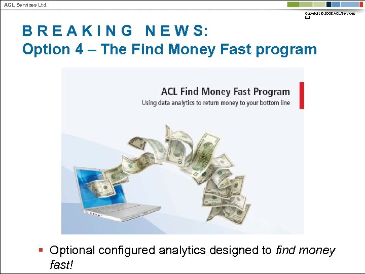 ACL Services Ltd. Copyright © 2008 ACL Services Ltd. B R E A K I N G N E W S: Option 4 – The Find Money Fast program § Optional configured analytics designed to find money fast!