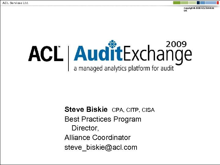 ACL Services Ltd. Copyright © 2008 ACL Services Ltd. Steve Biskie CPA, CITP, CISA Best Practices Program Director, Alliance Coordinator steve_biskie@acl. com