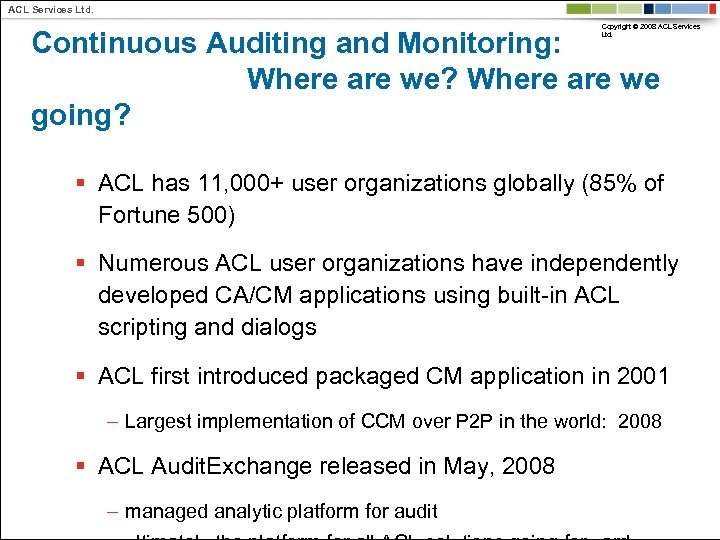ACL Services Ltd. Copyright © 2008 ACL Services Ltd. Continuous Auditing and Monitoring: Where are we? Where are we going? § ACL has 11, 000+ user organizations globally (85% of Fortune 500) § Numerous ACL user organizations have independently developed CA/CM applications using built-in ACL scripting and dialogs § ACL first introduced packaged CM application in 2001 – Largest implementation of CCM over P 2 P in the world: 2008 § ACL Audit. Exchange released in May, 2008 – managed analytic platform for audit