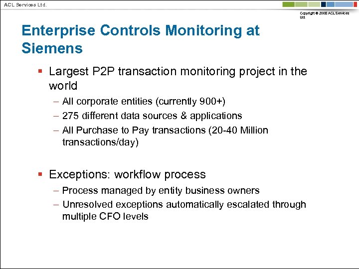 ACL Services Ltd. Copyright © 2008 ACL Services Ltd. Enterprise Controls Monitoring at Siemens § Largest P 2 P transaction monitoring project in the world – All corporate entities (currently 900+) – 275 different data sources & applications – All Purchase to Pay transactions (20 -40 Million transactions/day) § Exceptions: workflow process – Process managed by entity business owners – Unresolved exceptions automatically escalated through multiple CFO levels