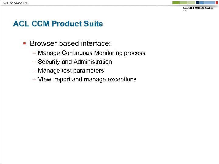 ACL Services Ltd. Copyright © 2008 ACL Services Ltd. ACL CCM Product Suite § Browser-based interface: – – Manage Continuous Monitoring process Security and Administration Manage test parameters View, report and manage exceptions
