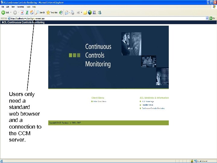 The Leading Global Provider of Audit Analytics Technology Copyright © 2008 ACL Services Ltd. Users only need a standard web browser and a connection to the CCM server.