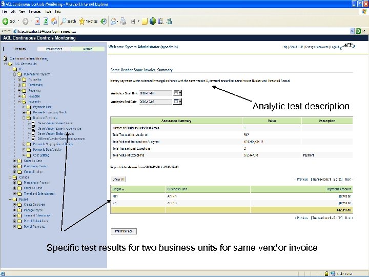 ACL Services Ltd. Copyright © 2008 ACL Services Ltd. Analytic test description Specific test results for two business units for same vendor invoice