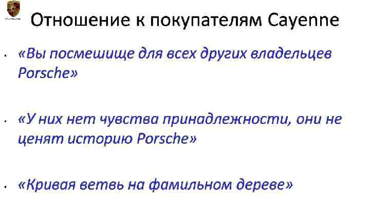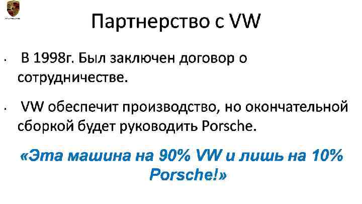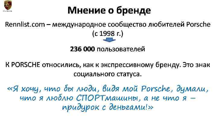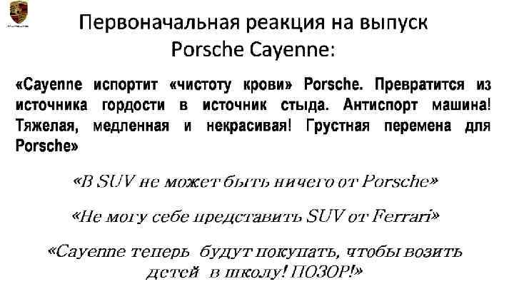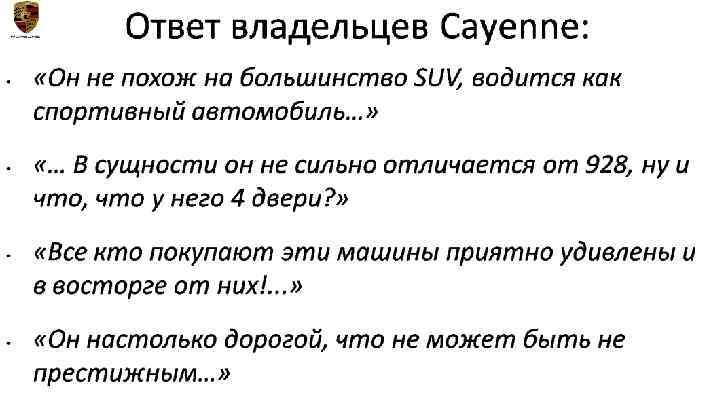 SWOT-анализ Strengths Сильнейший бренд • База лояльных потребителей • Сильная научно-техническая база и опыт разработки автомобилей Weaknesses Узкая продуктовая линейка • Отсутствие опыта конструирования автомобилей вне спорт класса • Сильная привязка бренда к спорткарам • • Opportunities Threats Выход на новые сегменты рынка • Внедрение новых технологий производства • Стратегическое партнерство с другими концернами • Высокая конкуренция на рынке • Колебания валют (сильный евро) • Ужесточение экологических норм и норм безопасности •