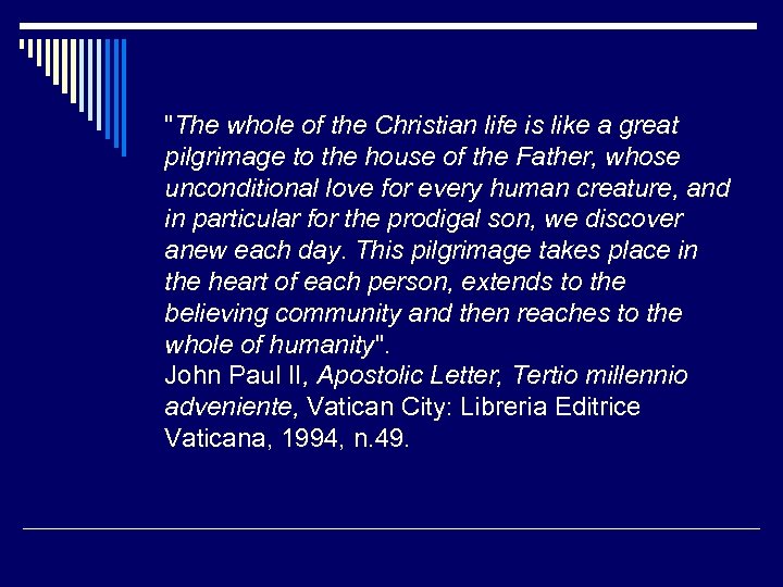 "The whole of the Christian life is like a great pilgrimage to the house of the Father, whose unconditional love for every human creature, and in particular for the prodigal son, we discover anew each day. This pilgrimage takes place in the heart of each person, extends to the believing community and then reaches to the whole of humanity". John Paul II, Apostolic Letter, Tertio millennio adveniente, Vatican City: Libreria Editrice Vaticana, 1994, n. 49.
