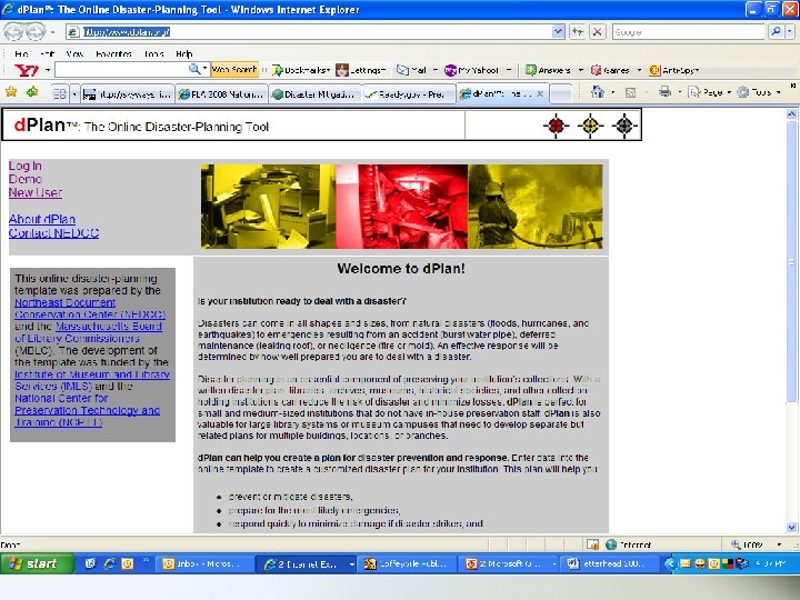 d. Plan n www. dplan. org d. Plan is designed to help institutions of all sizes: n Small and medium-sized institutions that do not have in-house preservation staff n University libraries, museum campuses, or statewide library systems that need to develop separate but related plans for multiple buildings, locations, or branches n State agencies or professional associations that seek to structure training programs on disaster planning n