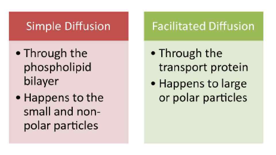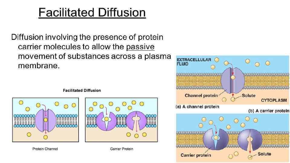 Facilitated diffusion • The movement of substances down a concentration gradient from an area of high concentration to an area of lower concentration without the need for energy to be used.