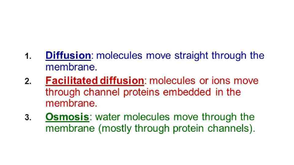 Terminology • • • • Passive transport Diffusion Facilitate diffusion Osmosis Concentration gradient Channel proteins Gate Carrier proteins Plasma membrane/permeable membrane Randomly Passive movement Lower/high solute concentration Isotonic/hypertonic/hypotonic