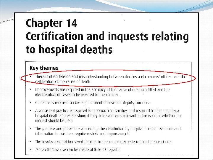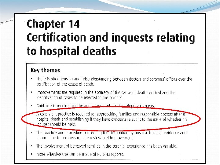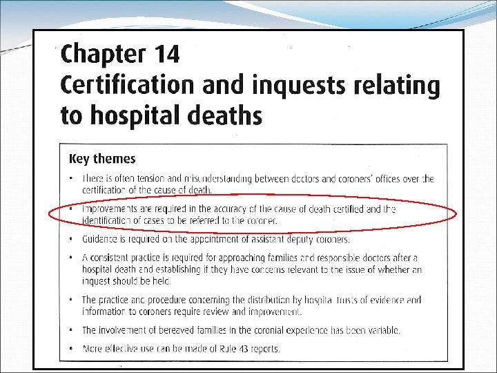 The vague boundary between natural and unnatural? Roberts IS, Gorodkin LM, Benbow EW. J Clin Pathol. 2000; 53: 367 -73. What is a natural cause of death? A survey of how coroners in England Wales approach borderline cases. Clinical scenarios circulated to all coroners in England & Wales “There is considerable variation in the way in which coroners approach these borderline cases, many of which are common in clinical practice. This study indicates a need for discussion, working towards a national consensus on such issues. It highlights the importance of good communication between coroners and medical staff at a local level.