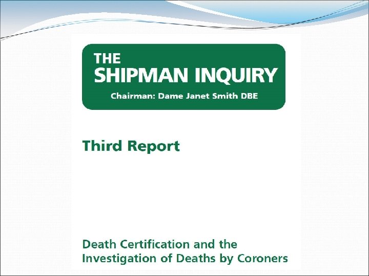 Harold Shipman. . . Killed patients (morphine injection) In their home or in his GP surgery Wrote ‘natural cause’ death certificates Wrote cremation forms Never referred cases to the coroner 2 were autopsied, but pathologists did not identify malfeasance Was intelligent, up-to-date and generally liked by his patients i. e. Medical Revalidation won’t catch the next Harold Shipman