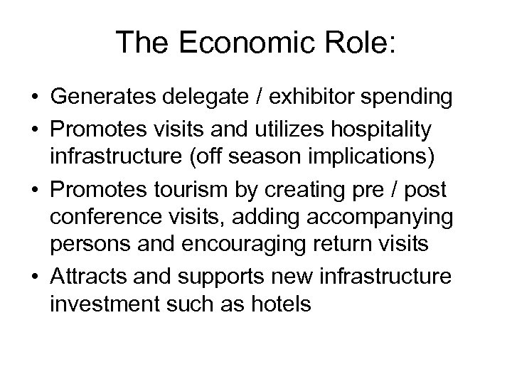 The Economic Role: • Generates delegate / exhibitor spending • Promotes visits and utilizes hospitality infrastructure (off season implications) • Promotes tourism by creating pre / post conference visits, adding accompanying persons and encouraging return visits • Attracts and supports new infrastructure investment such as hotels