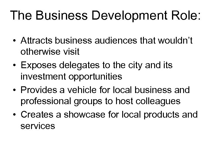 The Business Development Role: • Attracts business audiences that wouldn’t otherwise visit • Exposes delegates to the city and its investment opportunities • Provides a vehicle for local business and professional groups to host colleagues • Creates a showcase for local products and services
