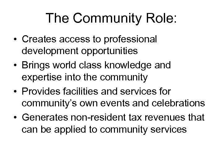 The Community Role: • Creates access to professional development opportunities • Brings world class knowledge and expertise into the community • Provides facilities and services for community’s own events and celebrations • Generates non-resident tax revenues that can be applied to community services