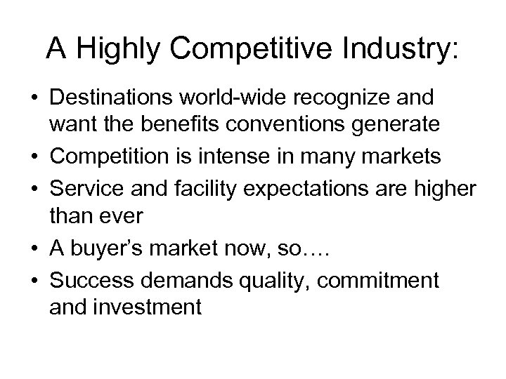 A Highly Competitive Industry: • Destinations world-wide recognize and want the benefits conventions generate • Competition is intense in many markets • Service and facility expectations are higher than ever • A buyer’s market now, so…. • Success demands quality, commitment and investment