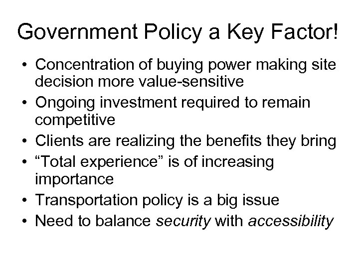 Government Policy a Key Factor! • Concentration of buying power making site decision more value-sensitive • Ongoing investment required to remain competitive • Clients are realizing the benefits they bring • “Total experience” is of increasing importance • Transportation policy is a big issue • Need to balance security with accessibility