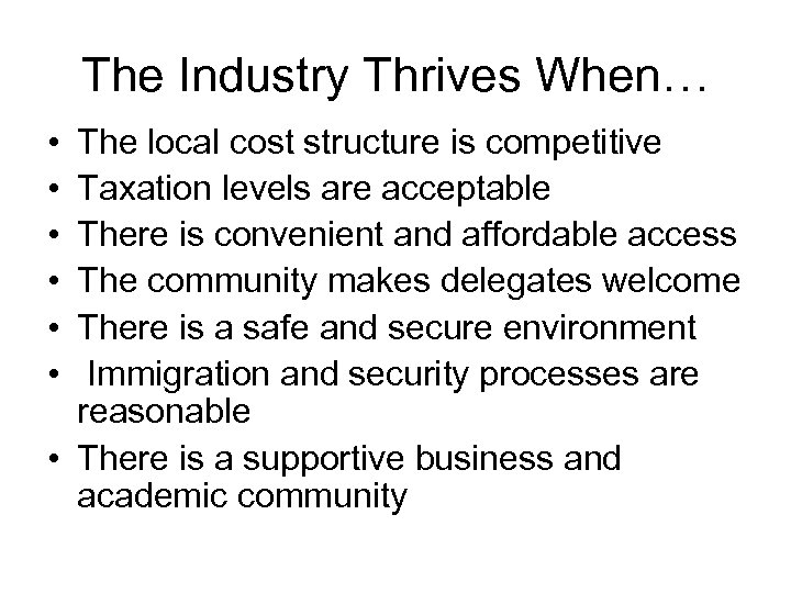 The Industry Thrives When… • • • The local cost structure is competitive Taxation levels are acceptable There is convenient and affordable access The community makes delegates welcome There is a safe and secure environment Immigration and security processes are reasonable • There is a supportive business and academic community
