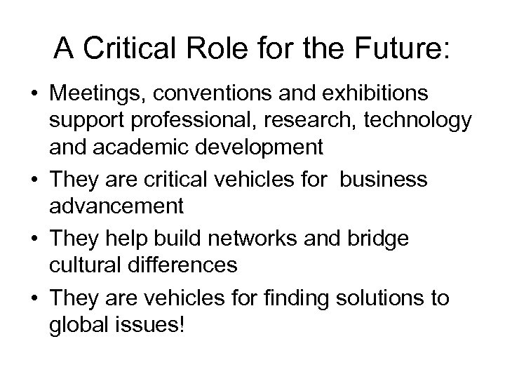 A Critical Role for the Future: • Meetings, conventions and exhibitions support professional, research, technology and academic development • They are critical vehicles for business advancement • They help build networks and bridge cultural differences • They are vehicles for finding solutions to global issues!