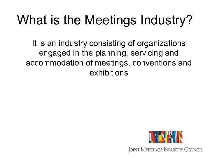 What is the Meetings Industry? It is an industry consisting of organizations engaged in the planning, servicing and accommodation of meetings, conventions and exhibitions