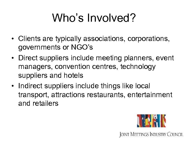 Who’s Involved? • Clients are typically associations, corporations, governments or NGO’s • Direct suppliers include meeting planners, event managers, convention centres, technology suppliers and hotels • Indirect suppliers include things like local transport, attractions restaurants, entertainment and retailers