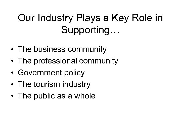 Our Industry Plays a Key Role in Supporting… • • • The business community The professional community Government policy The tourism industry The public as a whole