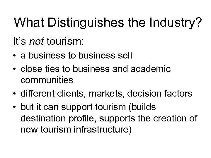 What Distinguishes the Industry? It’s not tourism: • a business to business sell • close ties to business and academic communities • different clients, markets, decision factors • but it can support tourism (builds destination profile, supports the creation of new tourism infrastructure)