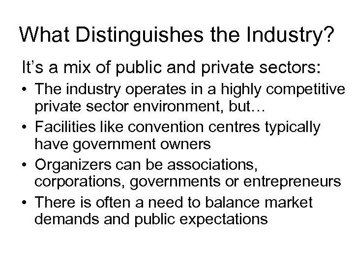 What Distinguishes the Industry? It’s a mix of public and private sectors: • The industry operates in a highly competitive private sector environment, but… • Facilities like convention centres typically have government owners • Organizers can be associations, corporations, governments or entrepreneurs • There is often a need to balance market demands and public expectations