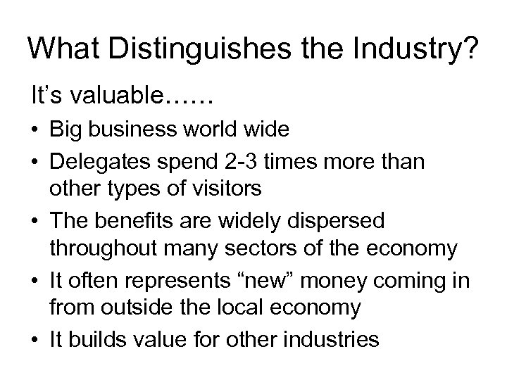 What Distinguishes the Industry? It’s valuable…… • Big business world wide • Delegates spend 2 -3 times more than other types of visitors • The benefits are widely dispersed throughout many sectors of the economy • It often represents “new” money coming in from outside the local economy • It builds value for other industries