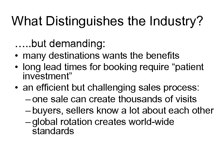 What Distinguishes the Industry? …. . but demanding: • many destinations wants the benefits • long lead times for booking require “patient investment” • an efficient but challenging sales process: – one sale can create thousands of visits – buyers, sellers know a lot about each other – global rotation creates world-wide standards