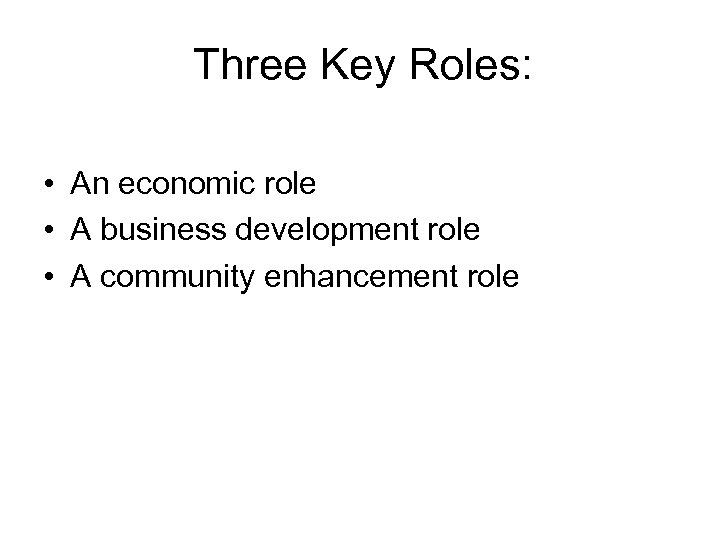 Three Key Roles: • An economic role • A business development role • A community enhancement role