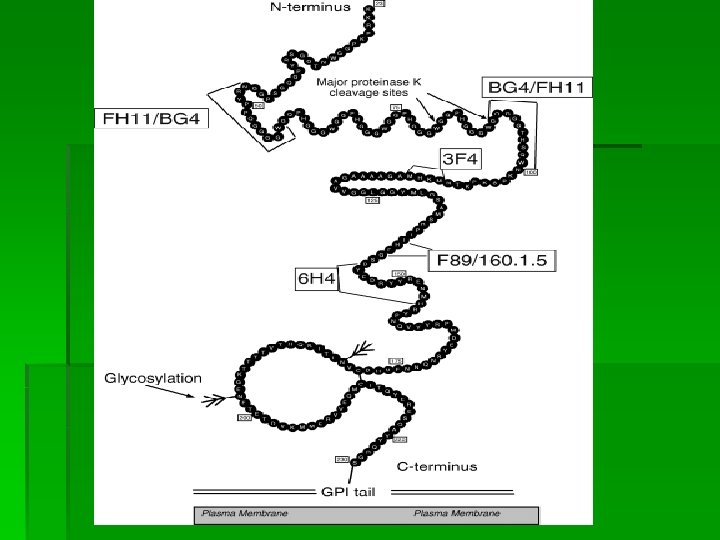Pr. Pc S-S Octapeptide repeat region Hydrophobic region GPI 180 196 1 23 1 -23 and 232 -254: signal sekvens GPI: Glycosylphosphatidylinositol anker 180 and 196: glycosylasjon seter 232 254