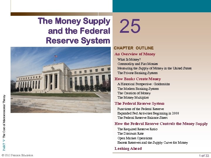 The Money Supply and the Federal Reserve System 25 CHAPTER OUTLINE An Overview of Money What Is Money? Commodity and Fiat Monies Measuring the Supply of Money in the United States The Private Banking System PART V The Core of Macroeconomic Theory How Banks Create Money © 2012 Pearson Education A Historical Perspective: Goldsmiths The Modern Banking System The Creation of Money The Money Multiplier The Federal Reserve System Functions of the Federal Reserve Expanded Fed Activities Beginning in 2008 The Federal Reserve Balance Sheet How the Federal Reserve Controls the Money Supply The Required Reserve Ratio The Discount Rate Open Market Operations Excess Reserves and the Supply Curve for Money Looking Ahead 1 of 33