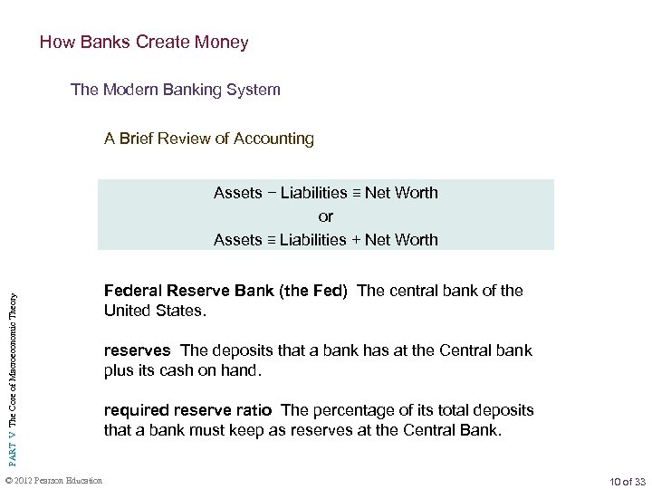 How Banks Create Money The Modern Banking System A Brief Review of Accounting PART V The Core of Macroeconomic Theory Assets − Liabilities ≡ Net Worth or Assets ≡ Liabilities + Net Worth © 2012 Pearson Education Federal Reserve Bank (the Fed) The central bank of the United States. reserves The deposits that a bank has at the Central bank plus its cash on hand. required reserve ratio The percentage of its total deposits that a bank must keep as reserves at the Central Bank. 10 of 33