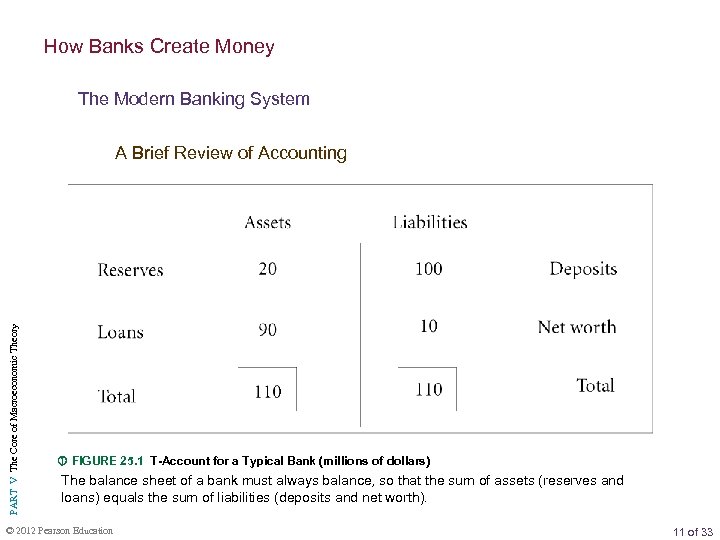 How Banks Create Money The Modern Banking System PART V The Core of Macroeconomic Theory A Brief Review of Accounting FIGURE 25. 1 T-Account for a Typical Bank (millions of dollars) The balance sheet of a bank must always balance, so that the sum of assets (reserves and loans) equals the sum of liabilities (deposits and net worth). © 2012 Pearson Education 11 of 33