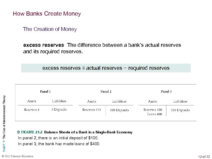 How Banks Create Money The Creation of Money excess reserves The difference between a bank’s actual reserves and its required reserves. PART V The Core of Macroeconomic Theory excess reserves ≡ actual reserves − required reserves FIGURE 25. 2 Balance Sheets of a Bank in a Single-Bank Economy In panel 2, there is an initial deposit of $100. In panel 3, the bank has made loans of $400. © 2012 Pearson Education 12 of 33