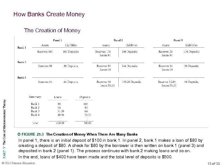 How Banks Create Money PART V The Core of Macroeconomic Theory The Creation of Money FIGURE 25. 3 The Creation of Money When There Are Many Banks In panel 1, there is an initial deposit of $100 in bank 1. In panel 2, bank 1 makes a loan of $80 by creating a deposit of $80. A check for $80 by the borrower is then written on bank 1 (panel 3) and deposited in bank 2 (panel 1). The process continues with bank 2 making loans and so on. In the end, loans of $400 have been made and the total level of deposits is $500. © 2012 Pearson Education 13 of 33