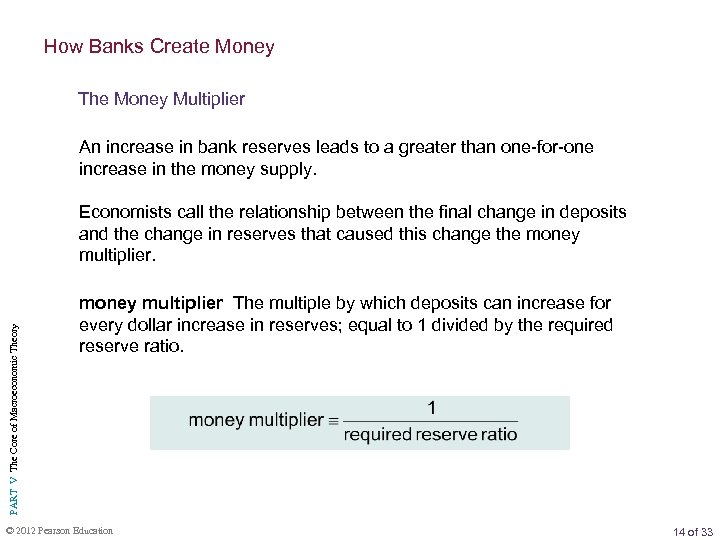 How Banks Create Money The Money Multiplier An increase in bank reserves leads to a greater than one-for-one increase in the money supply. PART V The Core of Macroeconomic Theory Economists call the relationship between the final change in deposits and the change in reserves that caused this change the money multiplier The multiple by which deposits can increase for every dollar increase in reserves; equal to 1 divided by the required reserve ratio. © 2012 Pearson Education 14 of 33