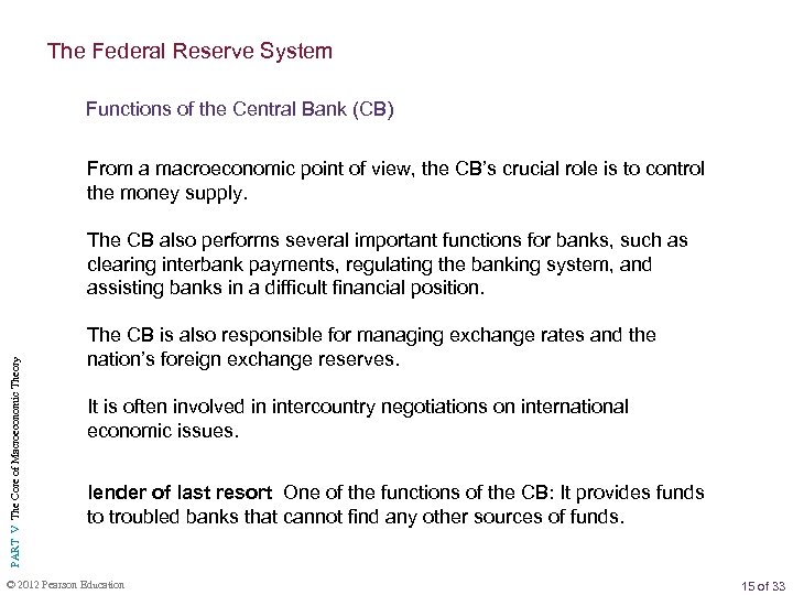 The Federal Reserve System Functions of the Central Bank (CB) From a macroeconomic point of view, the CB’s crucial role is to control the money supply. PART V The Core of Macroeconomic Theory The CB also performs several important functions for banks, such as clearing interbank payments, regulating the banking system, and assisting banks in a difficult financial position. The CB is also responsible for managing exchange rates and the nation’s foreign exchange reserves. It is often involved in intercountry negotiations on international economic issues. lender of last resort One of the functions of the CB: It provides funds to troubled banks that cannot find any other sources of funds. © 2012 Pearson Education 15 of 33