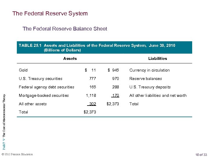 The Federal Reserve System The Federal Reserve Balance Sheet TABLE 25. 1 Assets and Liabilities of the Federal Reserve System, June 30, 2010 (Billions of Dollars) Assets 11 $ 945 U. S. Treasury securities 777 970 Reserve balances Federal agency debt securities PART V The Core of Macroeconomic Theory Gold Liabilities 165 288 U. S. Treasury deposits 1, 118 170 All other liabilities and net worth 302 $2, 373 Mortgage-backed securities All other assets Total © 2012 Pearson Education $ Currency in circulation Total $2, 373 16 of 33