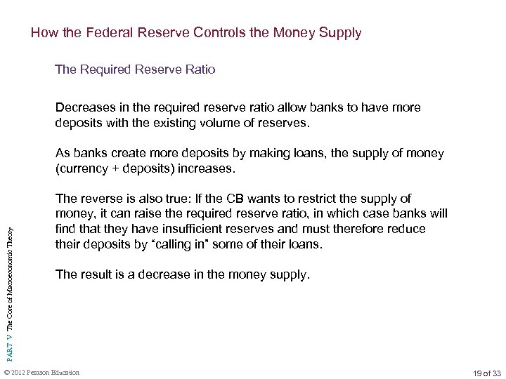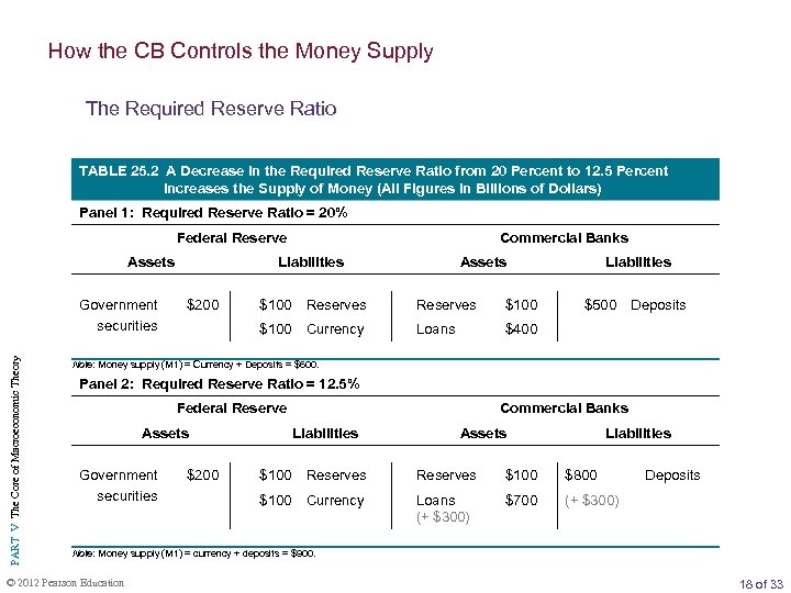 How the CB Controls the Money Supply The Required Reserve Ratio TABLE 25. 2 A Decrease in the Required Reserve Ratio from 20 Percent to 12. 5 Percent Increases the Supply of Money (All Figures in Billions of Dollars) Panel 1: Required Reserve Ratio = 20% Federal Reserve Assets PART V The Core of Macroeconomic Theory Government securities Commercial Banks Liabilities $200 Assets $100 Reserves $100 Currency Loans Liabilities $500 Deposits $400 Note: Money supply (M 1) = Currency + Deposits = $600. Panel 2: Required Reserve Ratio = 12. 5% Federal Reserve Assets Government securities $200 Commercial Banks Liabilities Assets Liabilities $100 Reserves $100 $800 $100 Currency Loans (+ $300) $700 Deposits (+ $300) Note: Money supply (M 1) = currency + deposits = $900. © 2012 Pearson Education 18 of 33