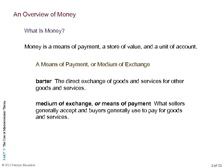 An Overview of Money What Is Money? Money is a means of payment, a store of value, and a unit of account. A Means of Payment, or Medium of Exchange PART V The Core of Macroeconomic Theory barter The direct exchange of goods and services for other goods and services. © 2012 Pearson Education medium of exchange, or means of payment What sellers generally accept and buyers generally use to pay for goods and services. 2 of 33