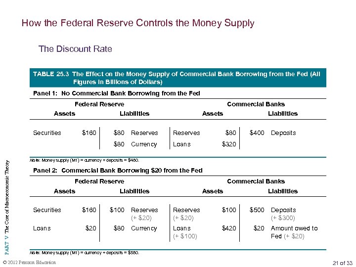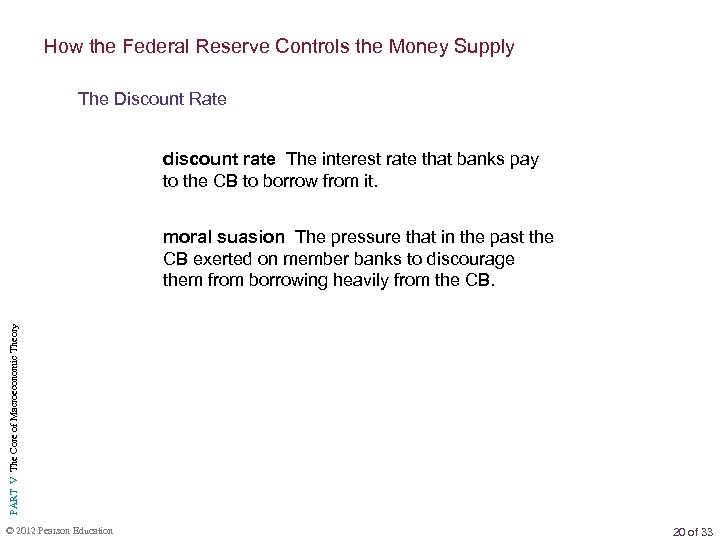 How the Federal Reserve Controls the Money Supply The Discount Rate discount rate The interest rate that banks pay to the CB to borrow from it. PART V The Core of Macroeconomic Theory moral suasion The pressure that in the past the CB exerted on member banks to discourage them from borrowing heavily from the CB. © 2012 Pearson Education 20 of 33